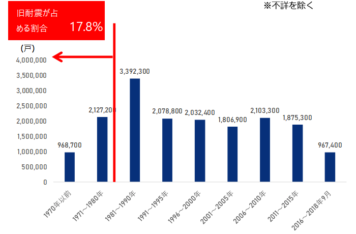 これによると、賃貸住宅(貸家)の総數は約1900萬戸。築年數別の戸數も集計されています。ちなみに、築年數がわかっているのは約1730萬戸で、そのうち1980年以前に建築された舊耐震物件は約300萬戸です。