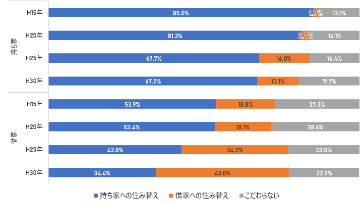 ※平成15年~平成25年は、単數回答だったが、平成30年では複數回答の選択肢となっているため、「持ち家」又は「借家(施設を含む)」「持ち家、借家にこだわらない」を2つ以上選んだ世帯は「持ち家、借家にこだわらない」として集計