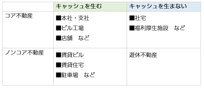 直接的にキャッシュを生まないコア不動産は、社宅、福利厚生施設などです。従業員にとって快適で機能的な職場環境を作ることは、結果的に資産性の向上につながることもあり、コア不動産の位置づけとなります。