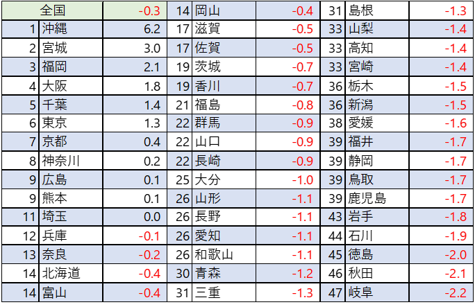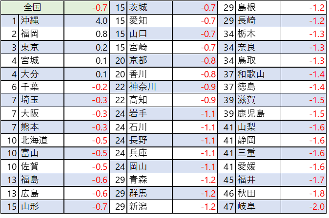 プラスになったのは5つの都県に留まっており、前年は15都道府県ありましたので、大幅に減りました。最も上昇したのは沖縄県で+4.0%(前年6.3%:1位)、つづいて福岡県+0.8%(前年1.7%:3位)、3番目は東京都で+0.2%(前年2.5%:2位)となっています。こうした上昇した都県においても、上昇幅は小さくなっています。