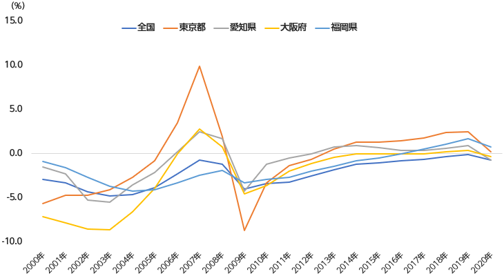 東京圏では-0.2%(前年+0.9%)、大阪圏-0.4%(前年+0.3%)、名古屋圏-0.7%(前年+1.0%)となっています。(國土交通省「令和2年都道府県地価調査」より)