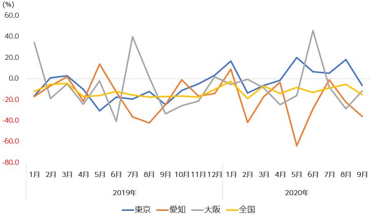 図2は、2019年~2020年の貸家著工數(shù)の前年同月比の月別の推移です。東京が回復(fù)基調(diào)にあり、またコロナ禍でもかなり善戦していることがわかります。また、愛知は、かなり苦戦が続いているという狀況です。