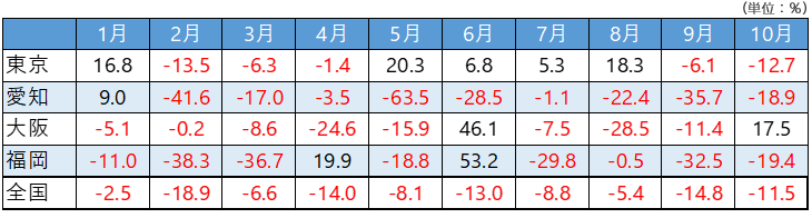 大阪は、4月以降、大幅なマイナスの月もありますが、それを吸収するように6月は+46.1%、10月+17.5%となっており、グラフはギザギザの形になっています。また、愛知や福岡は1~10月で大きく落としています。