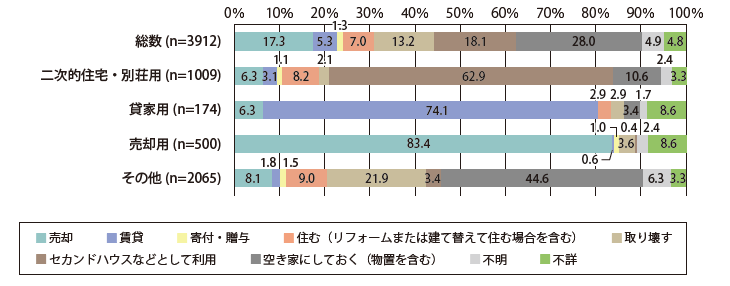今後5年程度のうちの利用意向についての質問では、「空き家にしておく(物置を含む)」が28.0%、「セカンドハウスなどとして利用」が18.1%、「売卻」が17.3%の順となっています。