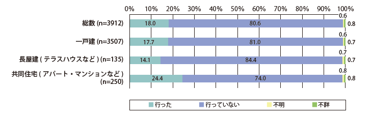 「建て方別の最近5年間のリフォーム工事の狀況」の結(jié)果を図5で見ると、全體では約18%の空き家物件で5年以內(nèi)にリフォームが行われています。しかし、これを共同住宅(アパート?マンション)に限ってみれば、約24%と大きく上昇しており、他の建て方に比べて最も多くなっています。