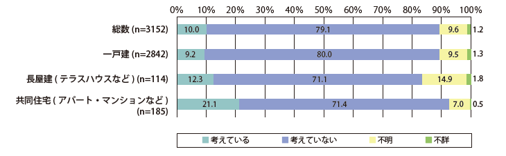 次に、「建て方別の今後のリフォーム工事の実施意向」の結(jié)果を図6で見ると、全體の10%が「今後リフォームを考えている」と答えています。しかし、これを共同住宅(アパート?マンション)に限ると2倍以上の約21%の方がリフォームを考えているようです。
