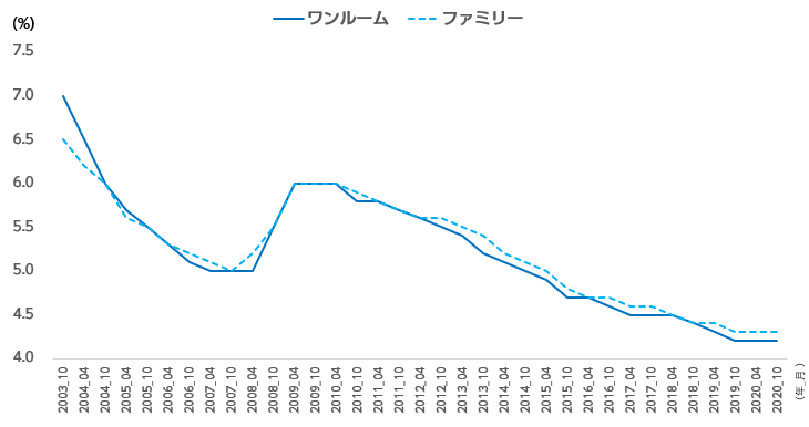 図3は、大阪エリアです。ファミリー物件のキャップレートは18年4月以降長く橫ばいが続いています。20年の1年間も変化はありませんでした。一方、ワンルームマンションのキャップレートは19年から20年にかけて、少し下がりました。