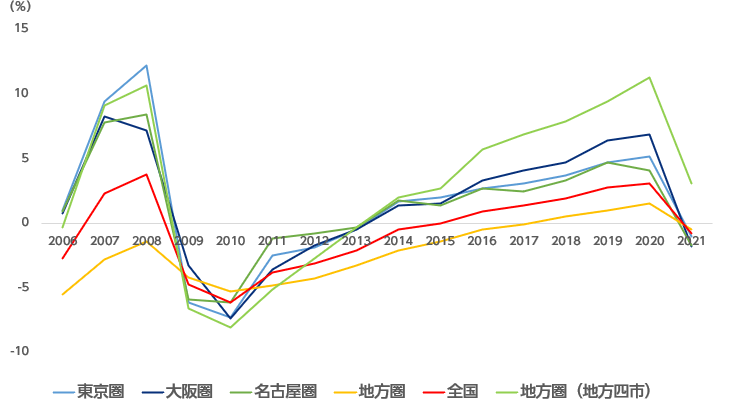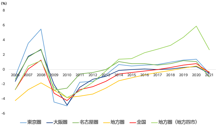 の全國平均は前年比-0.5%。昨年まで5年間続いたプラスから一転、6年ぶりにマイナスとなりました。新型コロナウイルスの影響は大きく、三大都市圏(東京圏、名古屋圏、大阪圏)はいずれもマイナス、地方圏全體でもマイナスとなりました。