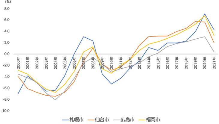 地方中核4市(札幌?仙臺?広島?福岡)では、全用途平均が+2.9%(前年は+7.4%)、住 宅地は+2.7%(前年は+5.9%)、商業地は+3.1%(前年は+11.3%)となり、いずれもプラスになりました。