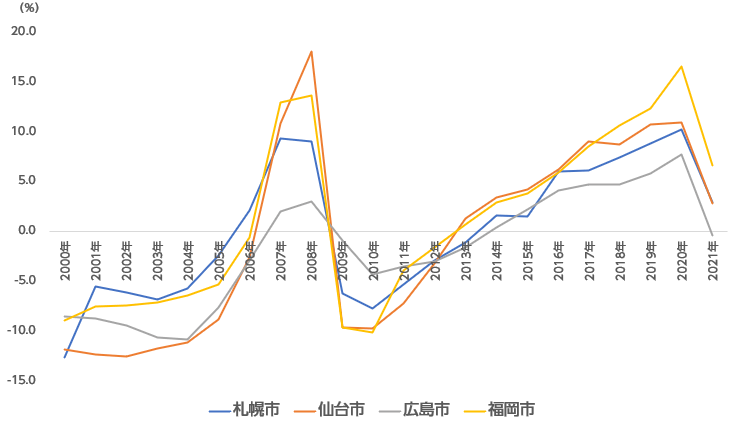図3:地方四市 地価公示変動率の推移(住宅地)