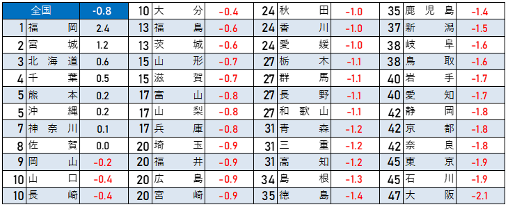 しかし、三大都市圏を除くすべての地方圏(上記4都市も含む)では、全用途平均が-0.3%(前年は+0.8%)、住宅地は-0.3%(前年は+0.5%)、商業地では-0.5%(前年は+1.5%)となりました。商業地は4年ぶりのマイナ