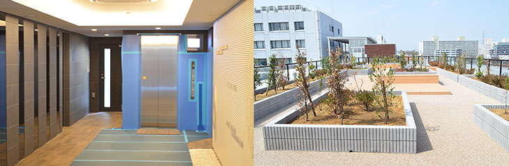 デザイン面では、「和」のテイストがいたるところに盛り込まれています。共用部には御影石や千鳥格子調サッシ、書家による館名板等を採用し、曲線部を織り交ぜ、意匠性を高めたデザインに仕上げました。 エントランスには枯山水のデザインパネルとトーンを抑えた鏡を配置し、空調完備の內廊下仕 様になっています。ホテル建築も手掛けている大和ハウス工業の幅広いネットワークを活用し、賃貸住宅のこうした內裝をホテルの內裝を手がける企業が擔當しました。また、屋上には板橋區の緑化計畫に基づいた屋上庭園を備えています。