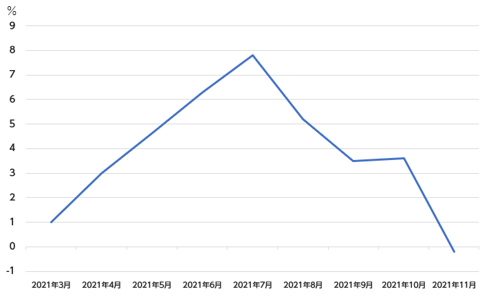 図2のグラフが示すように、上昇幅のピークは2021年7月で以降上昇ペースが落ち込み、2021年11月にはマイナス0.2となっています。つまり、いまだ高値展開ではあるものの、上昇局面から、徐々に調(diào)整局面に入っているものと思われます。