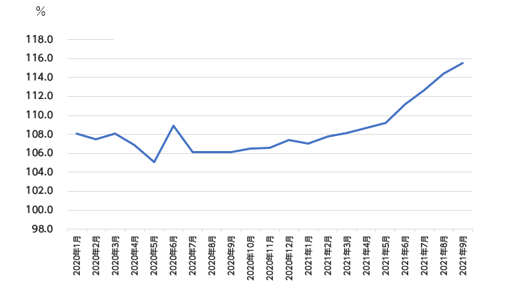 図3は、國土交通省が毎月公表している「建設(shè)?建築工事費(fèi)デフレータ」のうち、木材価格が最も大きく影響をもたらすであろう、「木造住宅工事費(fèi)デフレータ」だけを抽出したものです。データは最新(執(zhí)筆時(shí)2021年21年12月21日)の9月分までで、2015年基準(zhǔn)(=100)を指數(shù)化したものです。