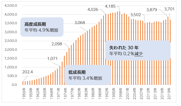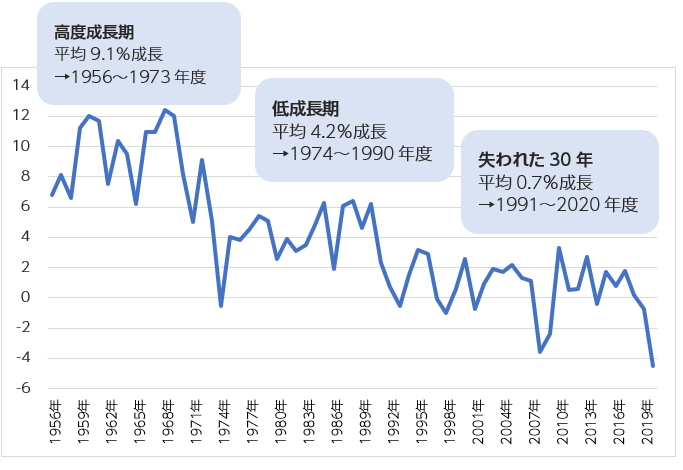 1991年(平成3年)~2020年(令和2年)度は、失われた30年といわれ、経済成長率は年平均約0.7%でした。