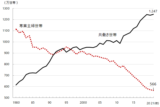 図3:専業主婦世帯と共働き世?。?980年~2021年)