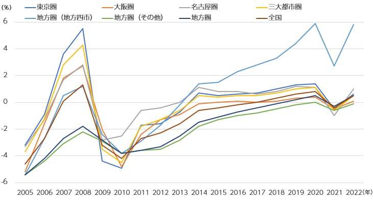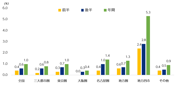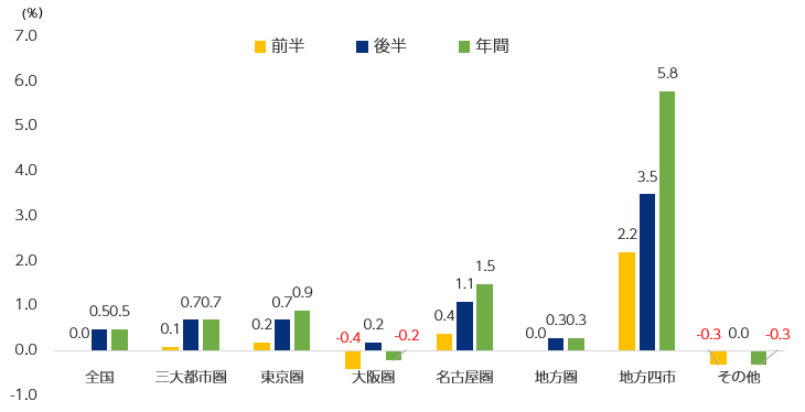 地方圏全體では、全用途平均は+0.5%(前年は-0.3%)、住宅地は+0.5%(前年は-0.3%)、商業地は+0.2%(前年は-0.5%)となり、いずれも2年ぶりにプラスに戻りました。