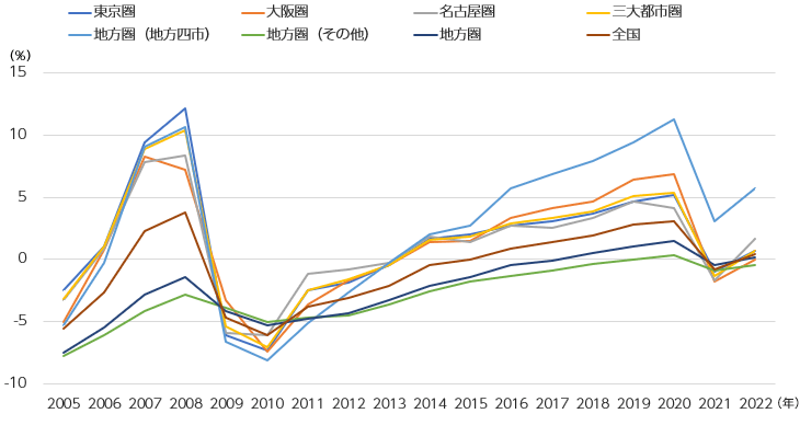 大阪圏は全用途平均で+0.2%(前年は-0.7%)、住宅地は+0.1%(前年は-0.5%)、商業地は±0%(前年は-1.8%)となりました。住宅地では、大阪市內中心部の一等立地にタワーマンションが建つなど、マンション価格上昇が続いており、プラス圏內になりました。2020年の大阪圏(大阪?京都?神戸などが中心)の住宅地では、三大都市圏での伸び率は最低(0.4%)だったものの、関西エリアはインバウンド観光客に人気のエリアという背景から、商業地は+6.9%と三大都市圏で最高の伸びを示していました。しかし、2021年は大きく下げていました。