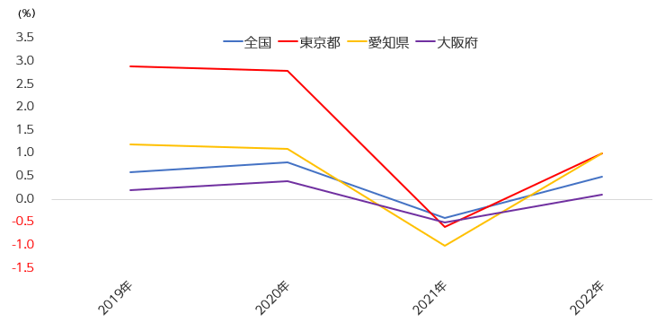 三大都市圏(東京圏?大阪圏?名古屋圏)では、全用途は+0.7%(前年は-0.7%)、住宅地は+0.5%(前年は-0.6%)、商業地は+0.7%(前年は-1.3%)となりました。三大都市圏全體ではいずれも昨年のマイナスからプラスに転じました。詳細は後述しますが、住宅地では三大都市全てが2年ぶりにプラスに転じ、商業地においては東京圏?名古屋圏はプラスに、大阪圏は橫ばい(±0)となりました。大都市部の住宅地では、中心部の利便性の高いエリアでは上昇が続いていますが、図1のグラフのとおり、コロナショック前2020年の水準に戻るのは2023年以降になりそうです。商業地では國內外の観光?ビジネス訪問(出張など)需要の回復が遅れていることもあり、マイナスからプラスには転じましが、まだ完全回復には至っていません。