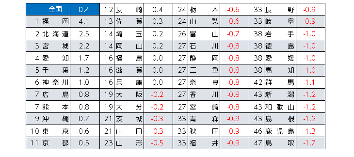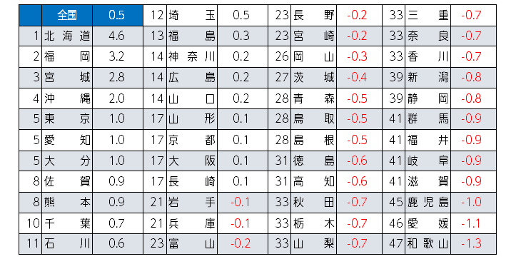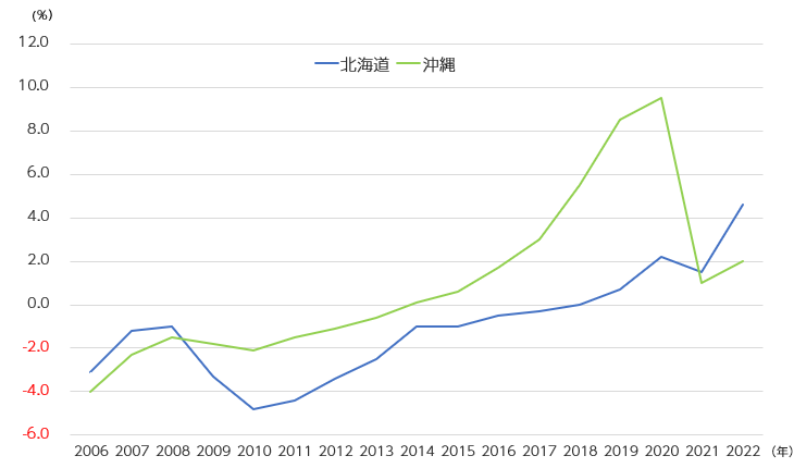 2018年から2020年まで住宅地地価上昇トップだった沖縄県は、2022年の上昇率は+2.0%。昨年は+1.0%でしたので、上昇幅が大きくなりましたが、回復とまではいっていないようです。