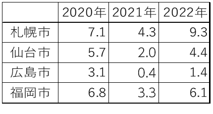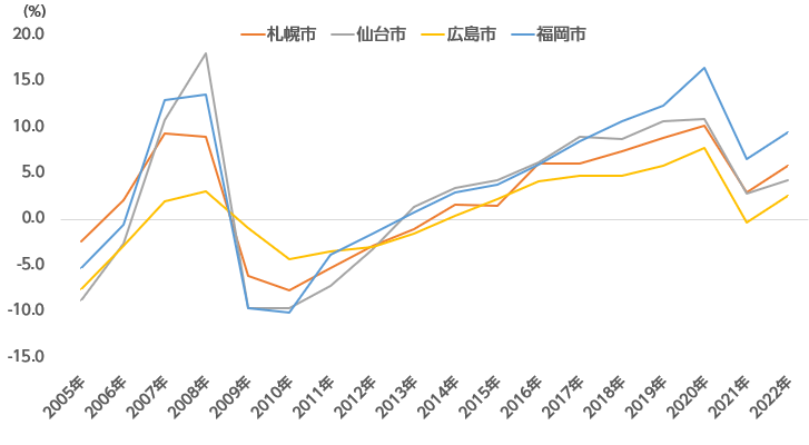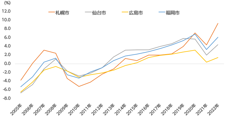 変動率の大きい順に並べると、金融緩和が進められた2013年以降では、2017年までは仙臺市と福岡市がほぼ並び、次いで札幌市→広島市となっていましたが、2020年以降は、札幌市と仙臺市がほぼ並んでいます。仙臺市については、上記のとおり東日本大震災の影響が少なからずあると思われます。