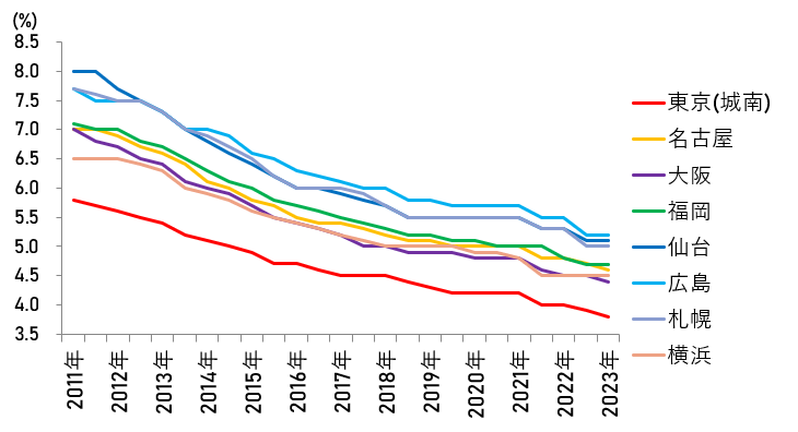 東京近郊の郊外ショッピングセンター(東京都心まで1時間程度、幹線道路沿いを想定)では5.2%でした。他のエリアにおける、主要エリアと郊外エリアの違いは、0.6ポイント~1.0ポイント程度となっています。東京都心部のズバ抜け感がうかがえます。