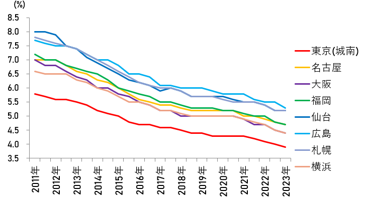 ワンルームタイプ(25~30m2、築5年未満、駅徒歩10分以內を想定)の賃貸住宅(一棟物件)のキャップレートは、調査を行った全國主要都市(10都市)のうち、東京城南?名古屋?大阪の3エリアで0.1ポイント低下しました。それ以外の7都市では橫ばいとなっています。