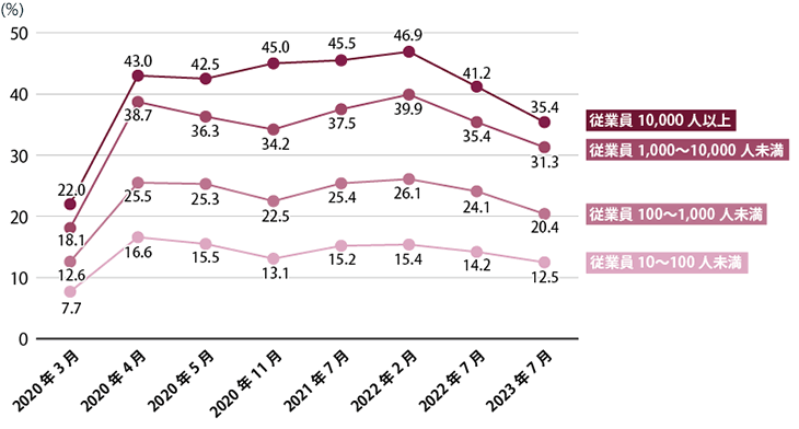 企業(yè)規(guī)模別に見ても、すべての規(guī)模の企業(yè)でテレワークの実施率は低下しています。しかし、従業(yè)員1萬(wàn)人以上の企業(yè)においては2023年においても、35.4%とテレワーク実施率は高く、ひとつの働き方として定著している企業(yè)もありそうです。