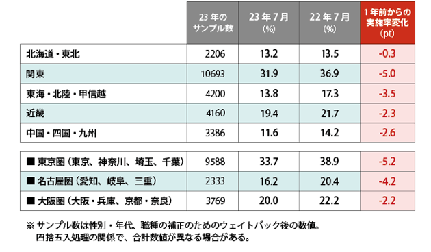 地域別に見ても、すべての地域において、テレワーク率は減少しています。しかし、関東でのテレワーク実施率が高く(東京都は2023年7月時(shí)點(diǎn)で38.8%、神奈川県では33.1%)、地域によって大きな差があります。