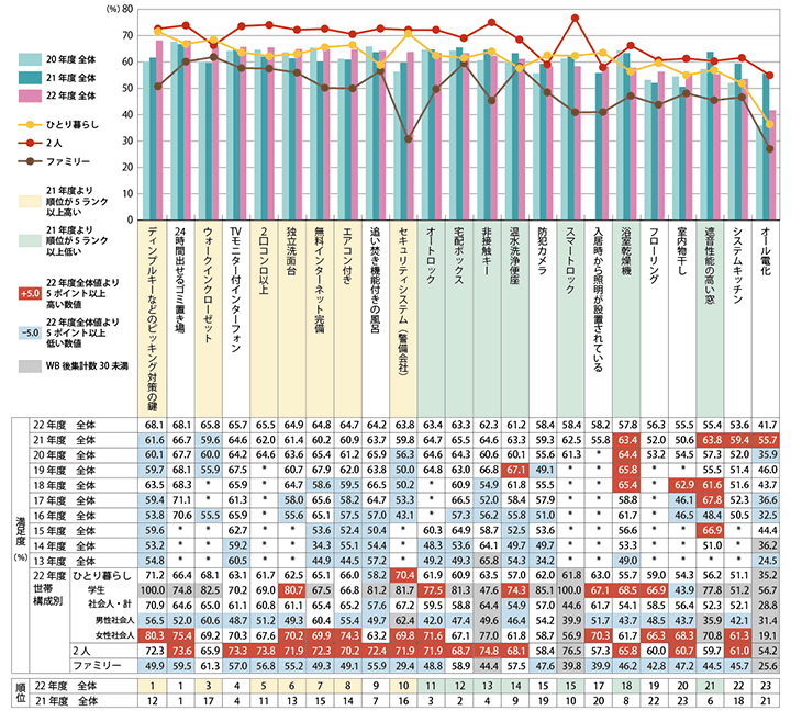 警備會(huì)社によるセキュリティシステム、ウォークインクローゼットも、2021年度から増加していますが、その一方で、浴室乾燥機(jī)やオール電化、遮音性能の高い窓などの設(shè)備は、2021年度よりも低下しており、2021年までの在宅時(shí)間の増加に伴う設(shè)備の充実への関心が一段落し、外出を伴った安全性やセキュリティに関心が向いている傾向が出ていると思われます。