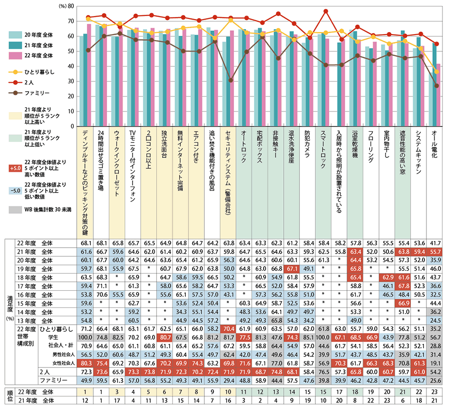世帯構(gòu)成別に見ると、女性社會(huì)人において「ディンプルキーなどのピッキング対策の鍵」「24時(shí)間出せるゴミ置き場(chǎng)」「室內(nèi)物干し」の満足度が全體に比べて高くなっています。