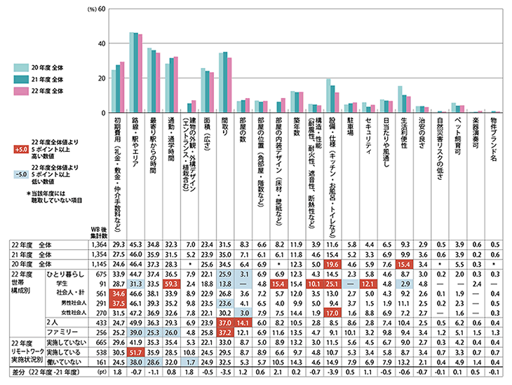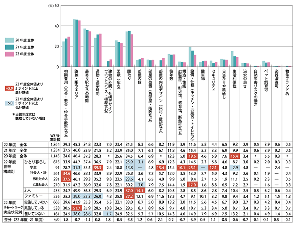 ただし、ご入居者の世帯によって決め手となった要素はかなり異なります。世帯構(gòu)成別に見ると、社會(huì)人の中で、男性は「初期費(fèi)用」、女性は「設(shè)備?仕様」が高くなっています。