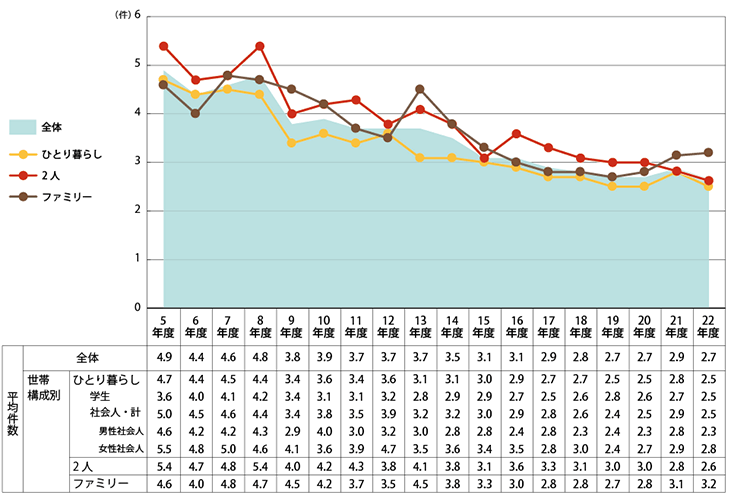部屋を決定する際、実際に見學(xué)した件數(shù)は、平均2.7件となり、意外に少ない件數(shù)となっています。インターネットやスマートフォンの普及や、ポータルサイトでの紹介內(nèi)容の充実、ユーザビリティの向上などによって、ここ20年近く、減少傾向となっていますが、2005年度と比較すれば、特に二人世帯では、約半分の件數(shù)となっています。ただし、ファミリー層においては、居住期間が長(zhǎng)いこともあり、一人暮らしや2人に比較して見學(xué)件數(shù)は多く、平均3.2件となっています。