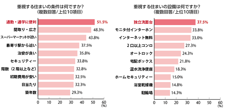 重視する住まいの條件は「通勤?通學(xué)に便利」が51.5%でトップになり、「間取り?広さ」を上回りました。時(shí)間を有効に使いたいというZ世代の特徴が表れているようです。