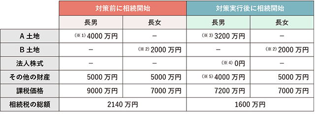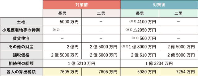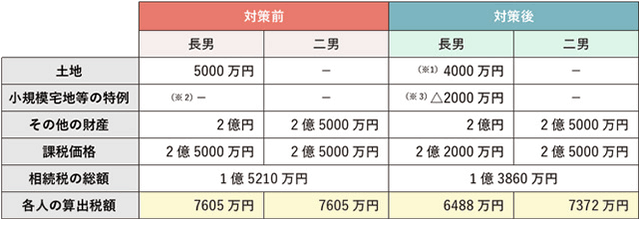 - ?対策前:長(zhǎng)男が土地及びその他の財(cái)産2億円を、二男がその他の財(cái)産2億5,000萬(wàn)円を相続する。