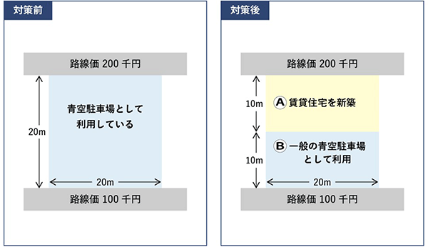 対策の実行により、利用の単位がA部分については貸宅地、B部分は自用地として別々の評(píng)価単位でもって評(píng)価することとなり、大きく宅地の評(píng)価額を下げることができます。