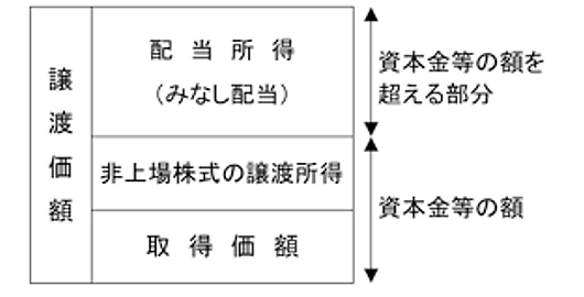 通常、個人が所有する非上場株式をその発行會社に譲渡(金融商品取引所の開設する市場における取引等を除きます)して、発行會社から対価として金銭その他の資産の交付を受けた場合、その交付を受けた金銭の額および金銭以外の資産の価額の合計額がその発行會社の資本金等の額のうち、その交付の基因となった株式に対応する部分の金額を超えるときは、その超える部分の金額は配當所得とみなされて所得稅が課稅されます。