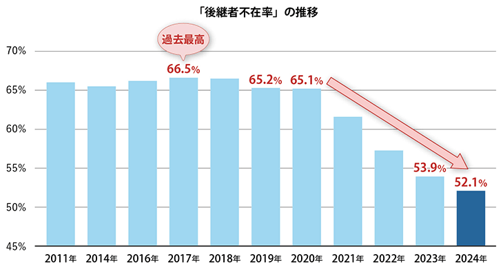 団塊世代が75歳以上となる2025年問題を控え、事業承継問題は大きな社會課題となっていますが、2024年11月、帝國データバンクから発表された、全國「後継者不在率」動向調査(2024年)によれば、2024年の後継者不在率は52.1%で、2023年と比較すると1.8ポイント低下しました。 この調査は、全國の全業種約27萬社を対象としたもので、後継者が「いない」、または「未定」とした企業は14.2萬社。2017年の66.5%をピークに、7年連続で前年の水準を下回りました。