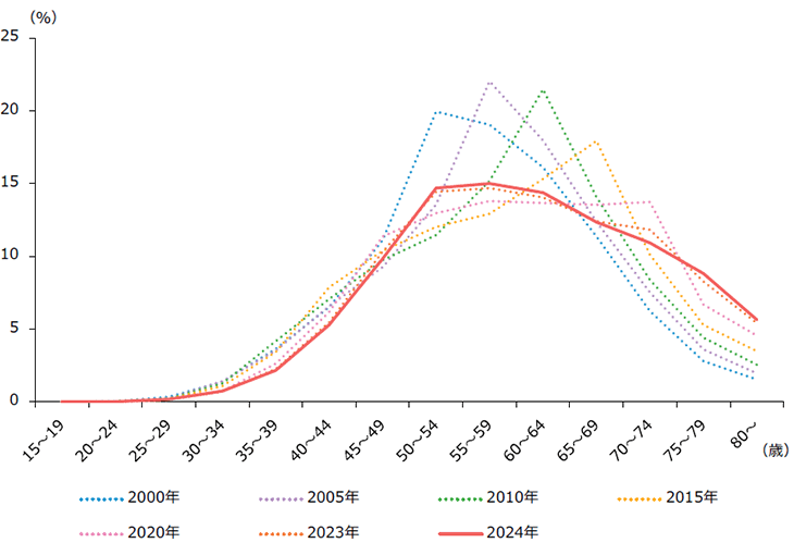 日本の中小企業(yè)における経営者年齢の分布を見ると、2000年から2015年にかけては、経営者年齢のピークが徐々に高齢化し、2020年以降は、平準化の傾向となっているのがわかります。しかし、75歳以上の経営者は、増加傾向を継続しており、60歳以上の経営者が過半數(shù)を占めています。