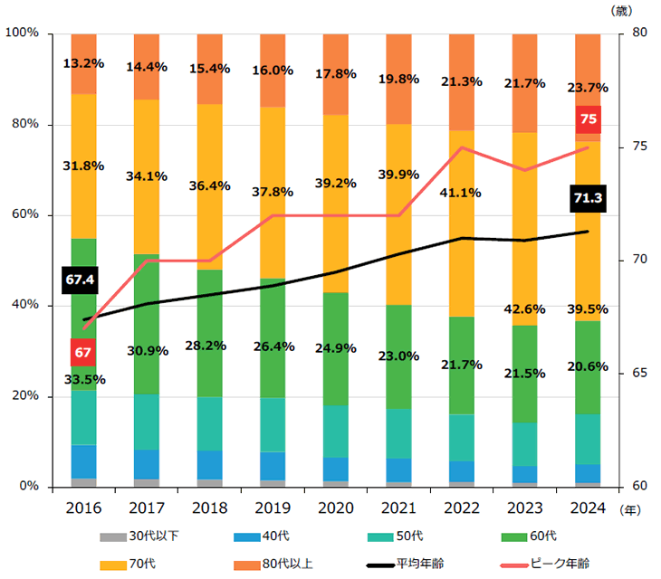 下図は、休廃業(yè)?解散件數(shù)の推移を見たものです。休廃業(yè)?解散件數(shù)は2019年から2022年までは減少傾向にあったものの、2023年に増加傾向に転じ、2024年には約7萬件となっています。ここへきて、高齢の経営者を持つ企業(yè)の休廃業(yè)?解散が増加しています。