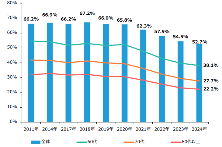 中小企業(yè)における後継者不在率の推移を、経営者の年代別に見ると、「全體」として後継者不在率は減少傾向となっています。経営者の年齢が60代以上の企業(yè)においても、減少傾向となっていますので、國の支援策やM&Aの増加によって、少なくとも後継者問題に関しては、ある程度の進展が見られます。中でも、60代の経営者の場合、2011年には半數(shù)を超えていたのが、2024年には38.1%と改善しており、後継者問題に早期から取り組む経営者が増加していることの表れだといえるでしょう。