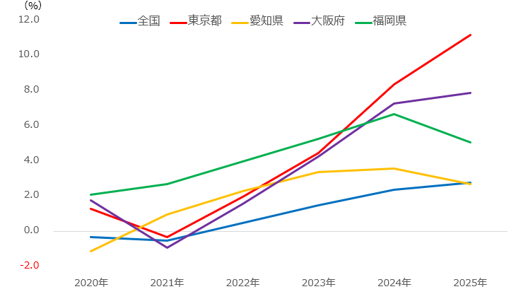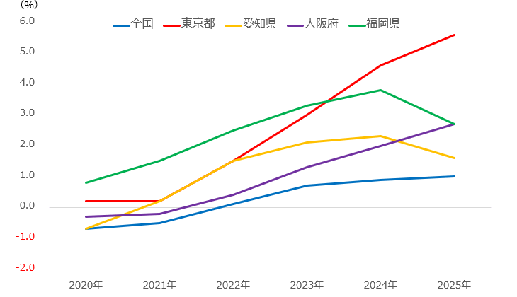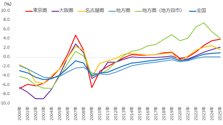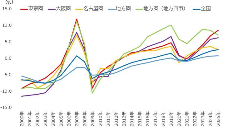 その一方で、地方四市を除く、「その他地方圏」では、±0.0%となり、30年ぶりにマイナス圏を脫しました。ちなみに、過去5年をみれば、2024年は-0.1%、2023年は-0.2%、2022年は-0.5%、2021年は-0.8%で順調(diào)に回復(fù)した足取りが伺えます。