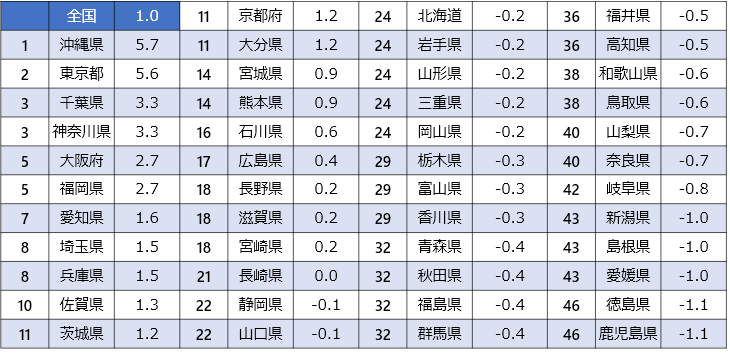 2位は昨年と同じく東京都で+5.6%(昨年は4.6%)、3位は千葉県と神奈川県で+3.3%(両県とも昨年は4位で+3.2%)5位は大阪府で+2.7%でした。