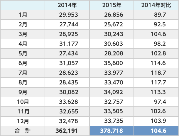 2015年の前年同月比対比を見てみると、1月、2月、4月は前年対比でマイナスとなっており、5月~9月は前年対比で大きくプラスとなっています。