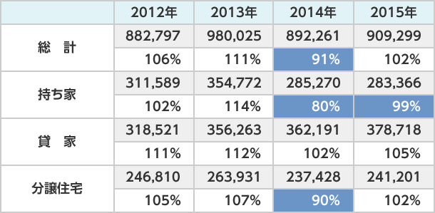 2014年の住宅著工戸數は、2013年に対して総數で-9%、持ち家では-20%(いずれも年ベース)と、2013年9月30日が區切りだった消費稅増稅前の駆け込み需要からの反動で、大きく減少しました。一方、主に賃貸用住宅のカテゴリーである貸家は、プラス2%となっていました。相続稅の改正がもたらすプラスの作用が、駆け込み需要からの反動減というマイナスの作用を上回った結果となりました。