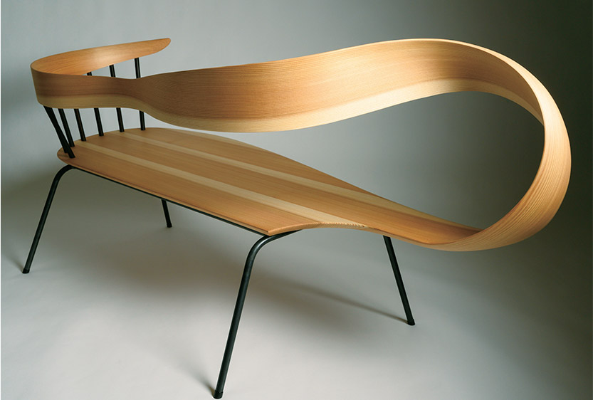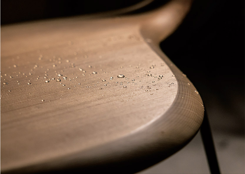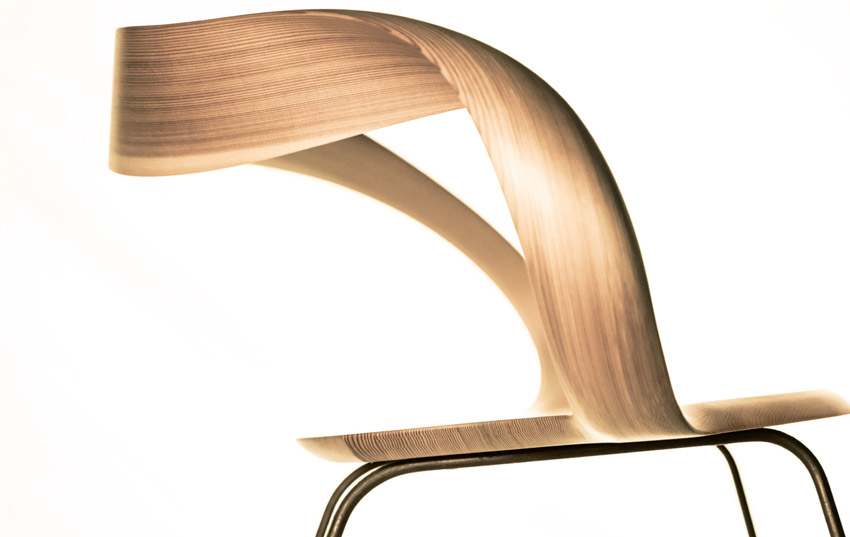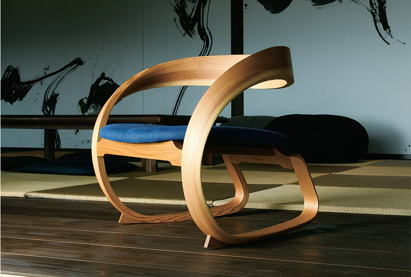 淡い紅色の木肌がまるで生きているかのようにうねり、なめらかな流線形を描く――背面から腳までひとつながりの曲線は洗練された美しさをもつだけでなく、木の立體的な動(dòng)きが人の體にフィットし、安定した座り心地を?qū)g現(xiàn)します。