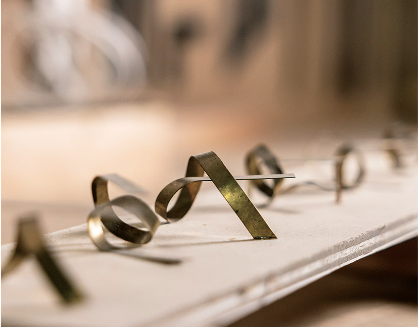 薄い一枚の板を曲げ、実寸大で形を構(gòu)成します。幅や曲げ方などを検証し、おおよその形を決定。そして、その形を?qū)g現(xiàn)するために必要な治具(じぐ)を作ります。