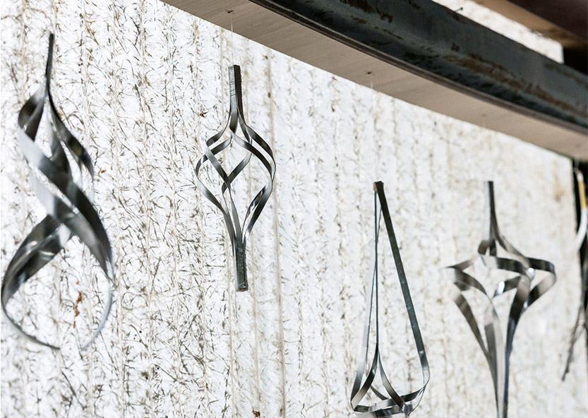 近年は椅子だけでなく、アート作品の製作にも力を入れています。フリーフォームラミネーションは木の曲がり方が一定でないことから、一點(diǎn)物と相性が良いのだそう。2019年には次世代の伝統(tǒng)工蕓に取り組む人々を応援するプロジェクトに參加し、建築家の隈研吾さんとのコラボレーション作品を発表しました。隈さんがデザインした模型をもとに、平井さんが制作を擔(dān)當(dāng)。全長(zhǎng)88mという長(zhǎng)さの板を使用し、ぐるぐると何重にも曲線を描いたオブジェをつくりあげました。「隈さんも、長(zhǎng)く、節(jié)がないという吉野杉のすばらしさをできるだけ生かそうとデザインされたのだと思います」