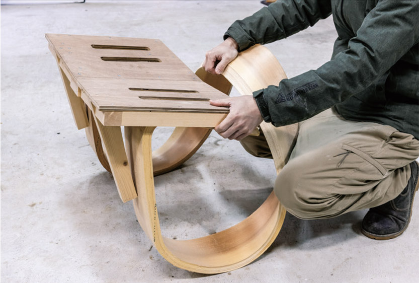 蕓術(shù)大學(xué)卒業(yè)後建設(shè)會(huì)社で勤務(wù)していた平井さんは、企業(yè)の一員として働くのではなく、自分で手を動(dòng)かし、ものづくりがしたいと考えるように。そこで、一人でデザインから製作、販売までできる家具づくりの道へ飛び込みました。岐阜で基本的な技術(shù)を?qū)Wんだ後、アイルランドで造形作家のジョセフ?ウォルシュ氏に師事し、フリーフォームラミネーションの技法を習(xí)得。そして、2017年に奈良県川上村でstudio Jig を開業(yè)しました?!讣揖撙扭辘诉mした広葉樹は世界的に不足しているため、最初から針葉樹を利用した家具づくりがしたいと考えていました。曲木技術(shù)と相性の良い吉野杉と出會(huì)い、川上村に移住。産地に住むことで木材が手に入りやすくなりますし、完成した家具にもストーリーが宿ると感じます」と平井さん。