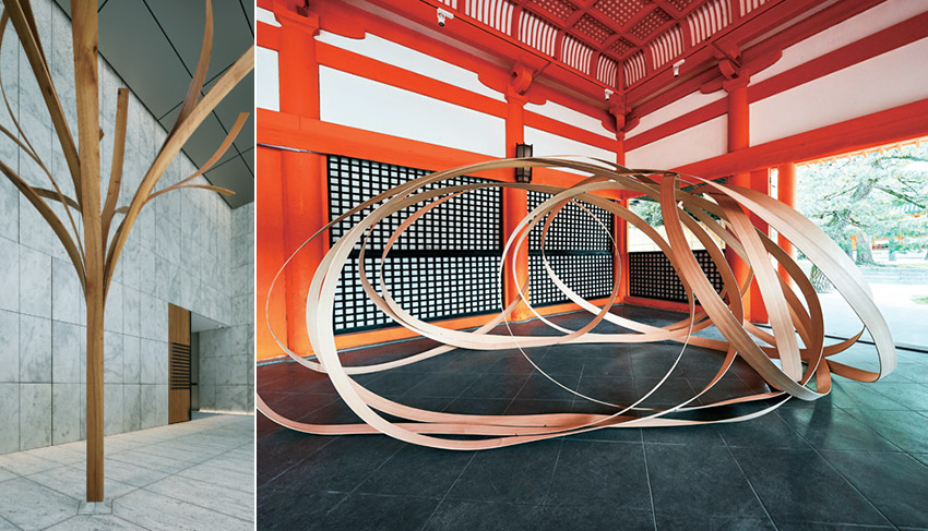 右:隈研吾さんとのコラボレーション作品「GURU-GURU」は、京都?平安神宮額殿で展示されました